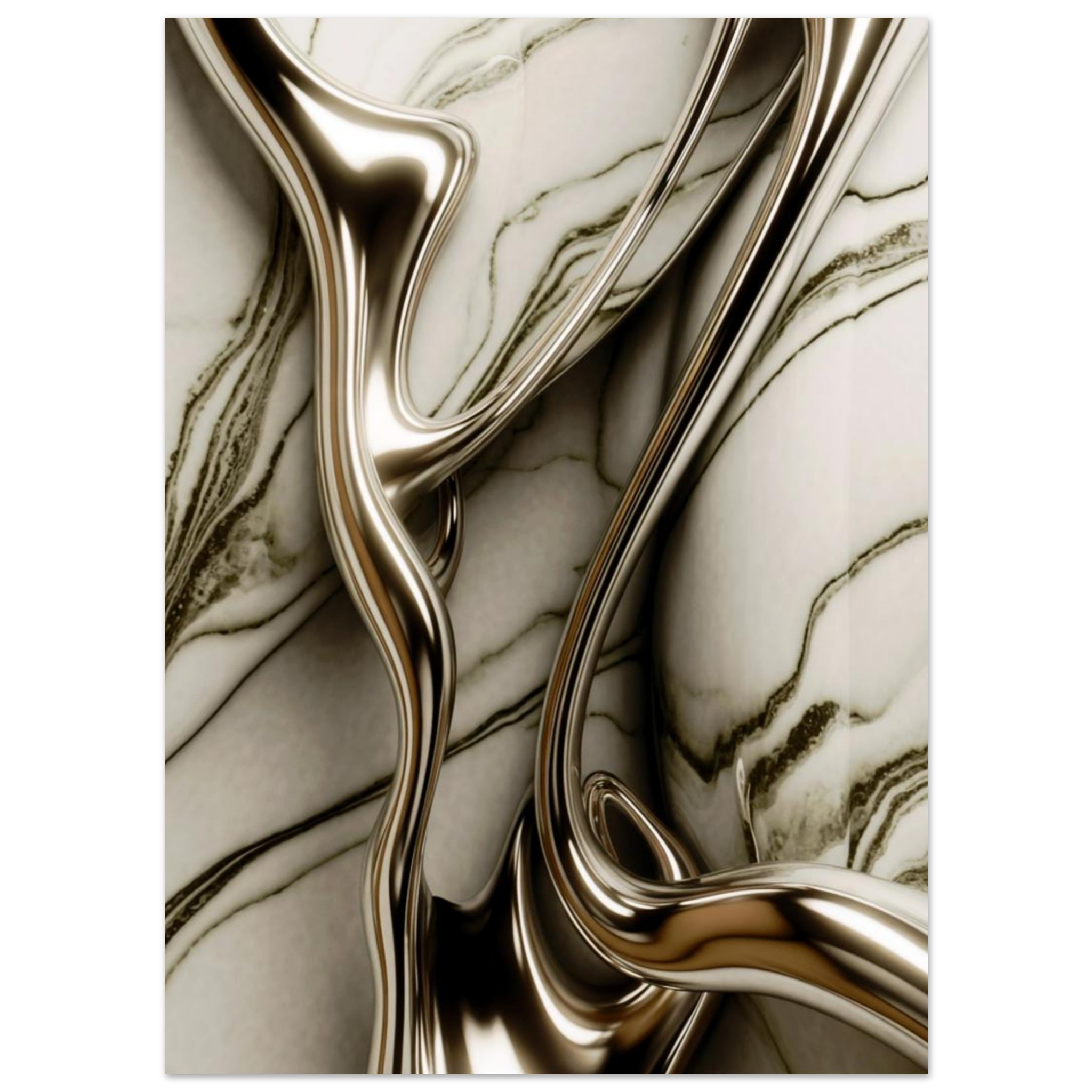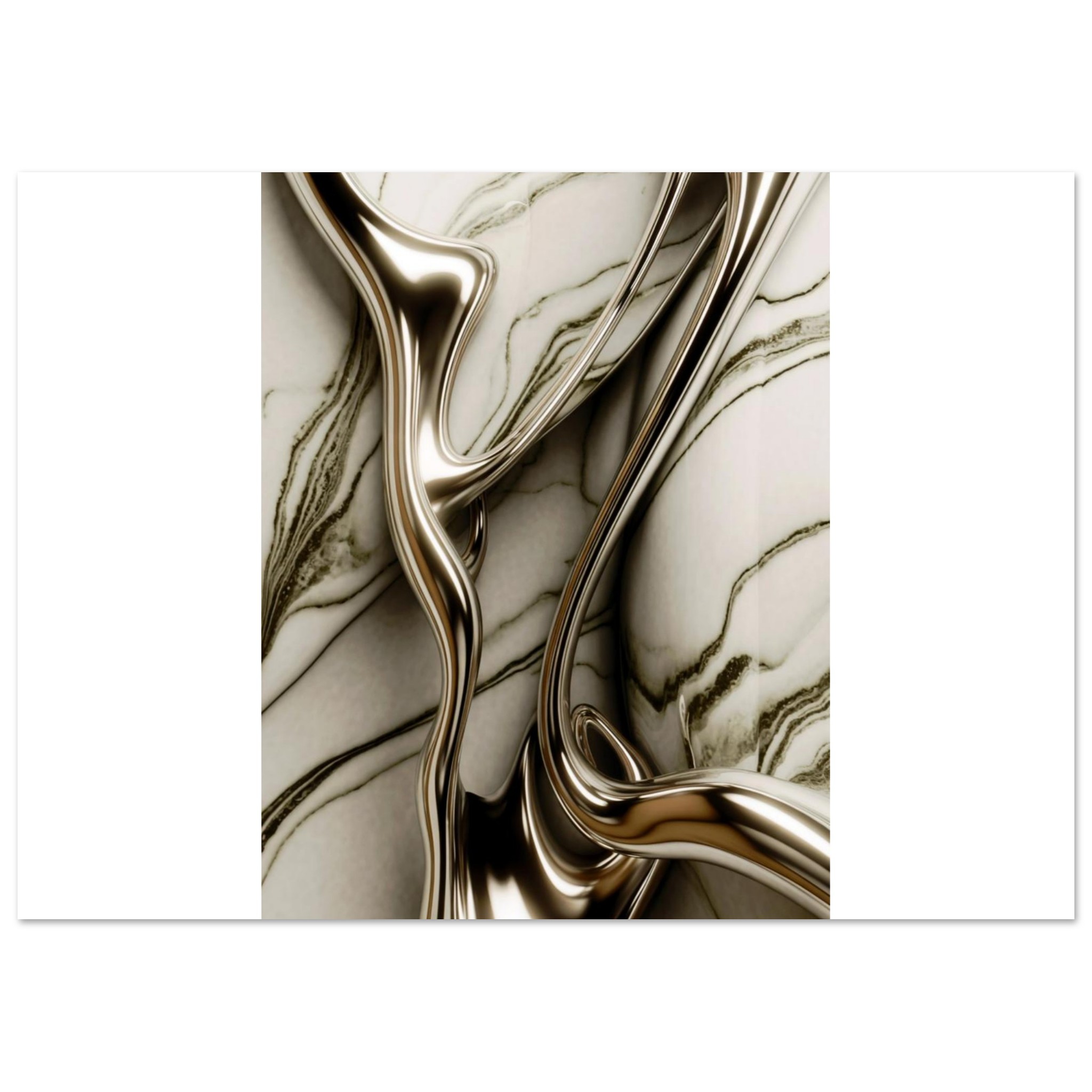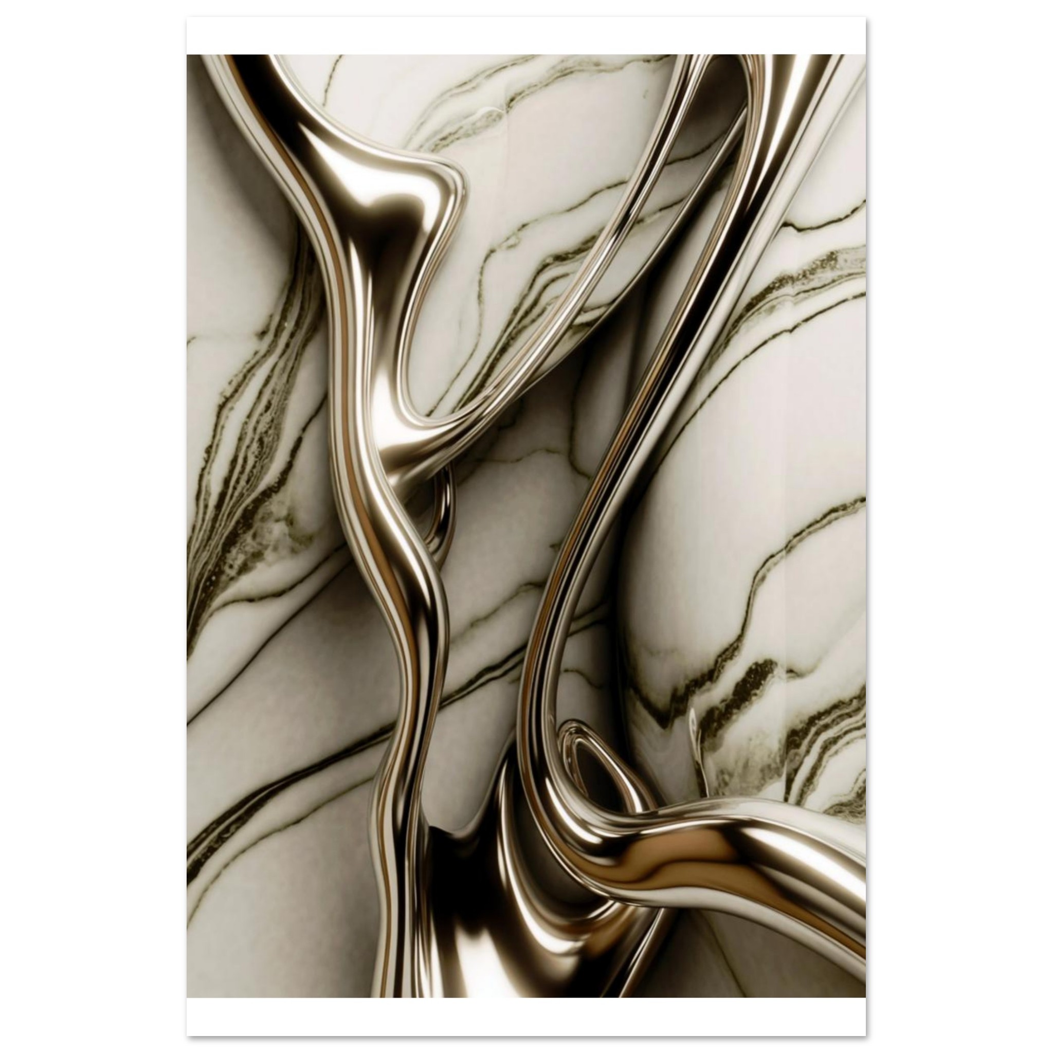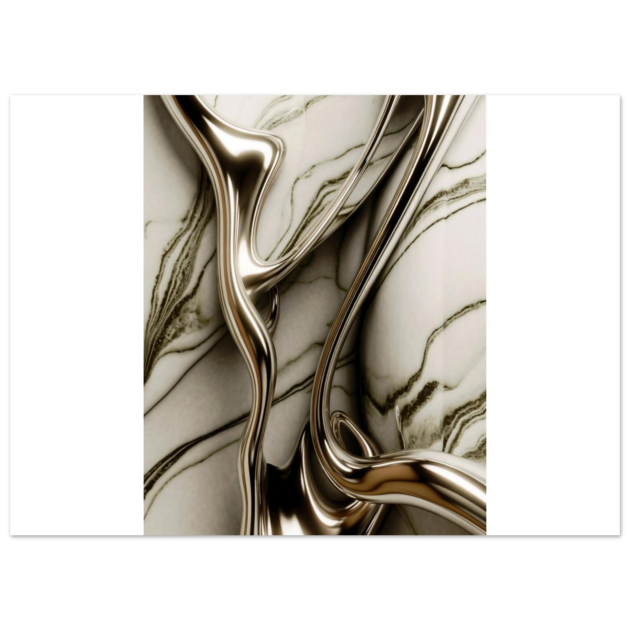 vereint fließende, silberne Formen mit einer feinen, hellen Marmorstruktur. Die sanften Linien erzeugen eine ruhige Dynamik und verleihen dem Motiv Tiefe, Klarheit und zeitlose Eleganz.