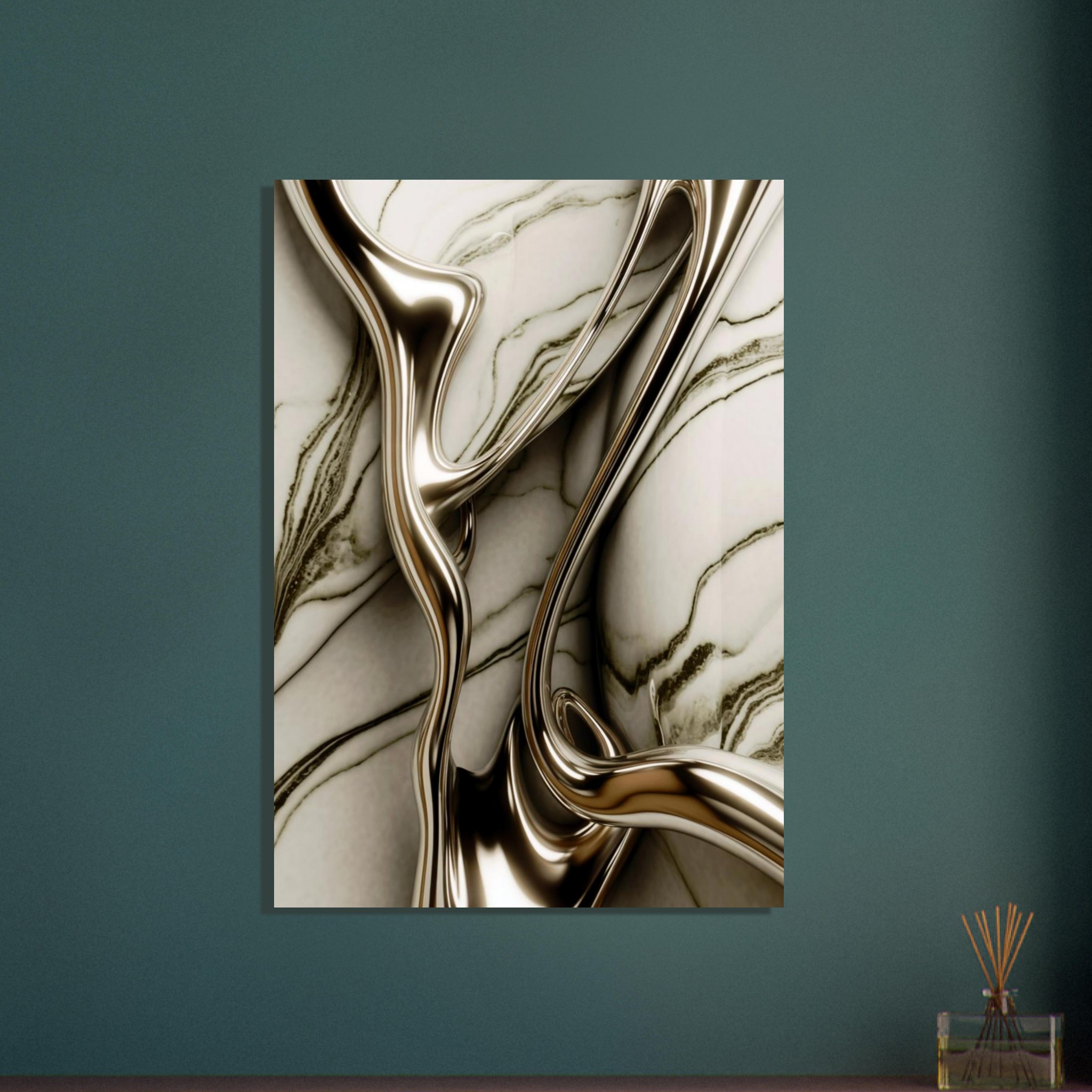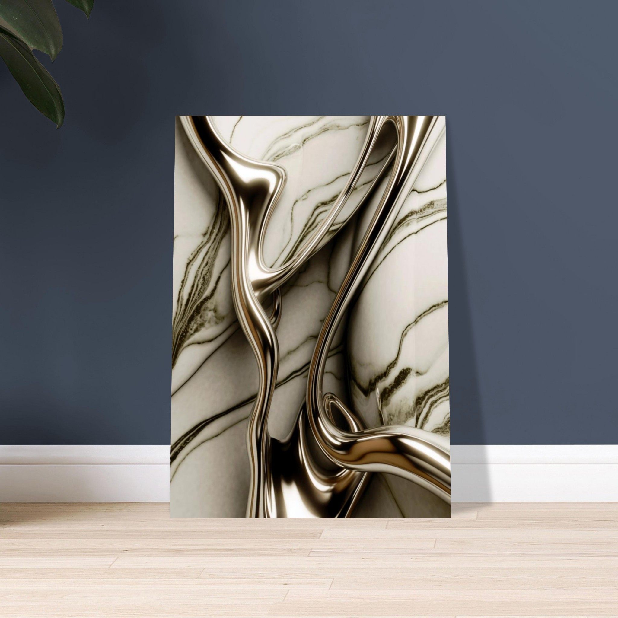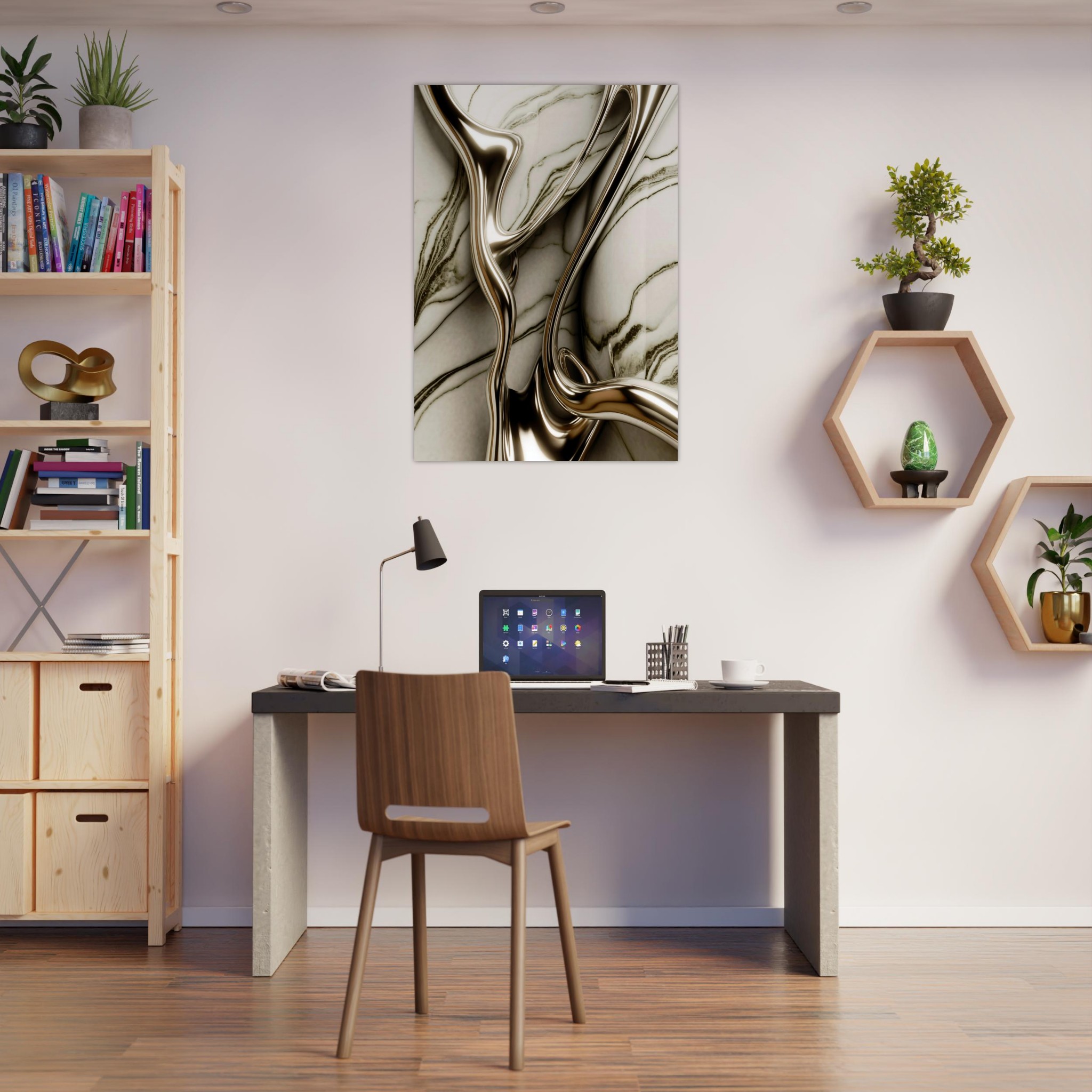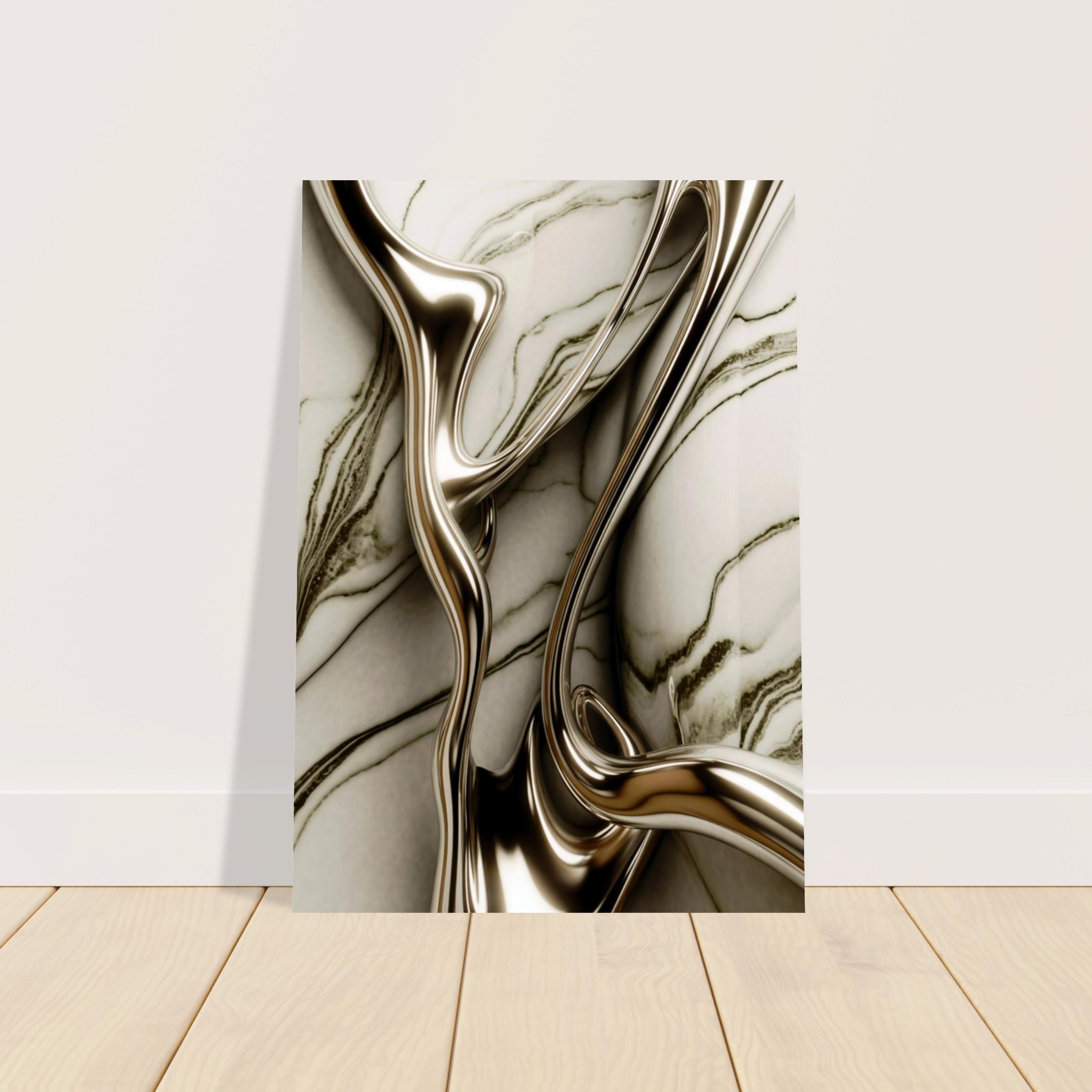 vereint fließende, silberne Formen mit einer feinen, hellen Marmorstruktur. Die sanften Linien erzeugen eine ruhige Dynamik und verleihen dem Motiv Tiefe, Klarheit und zeitlose Eleganz.